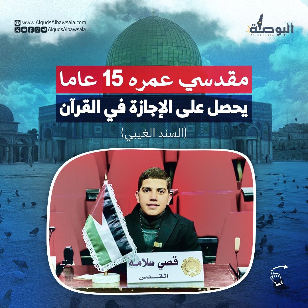 الفتى المقدسي قصي محمد سلامة (15عاما) من بلدة عناتا، يحصل على الإجازة في القرآن الكريم بسند غيبي متصل برسول الله صلى الله عليه وسلم، وذلك بعد إشهاره ختم القرآن قبل 9 أشهر في المسجد الأقصى.