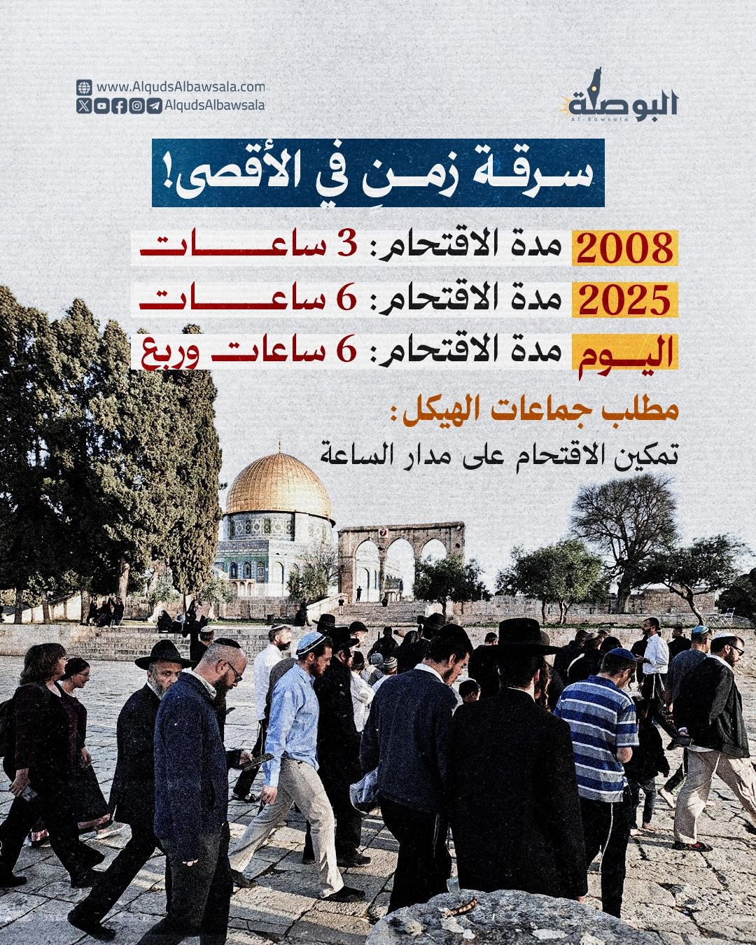 يذكر أنه وفي عام 2008 كانت فترة الاقتحامات 3 ساعات فقط، ثم تضاعفت حتى وصلت عام 2025 إلى 6 ساعات، ومنذ مايو الماضي حتى يومنا، وصلت 6 ساعات وربع.