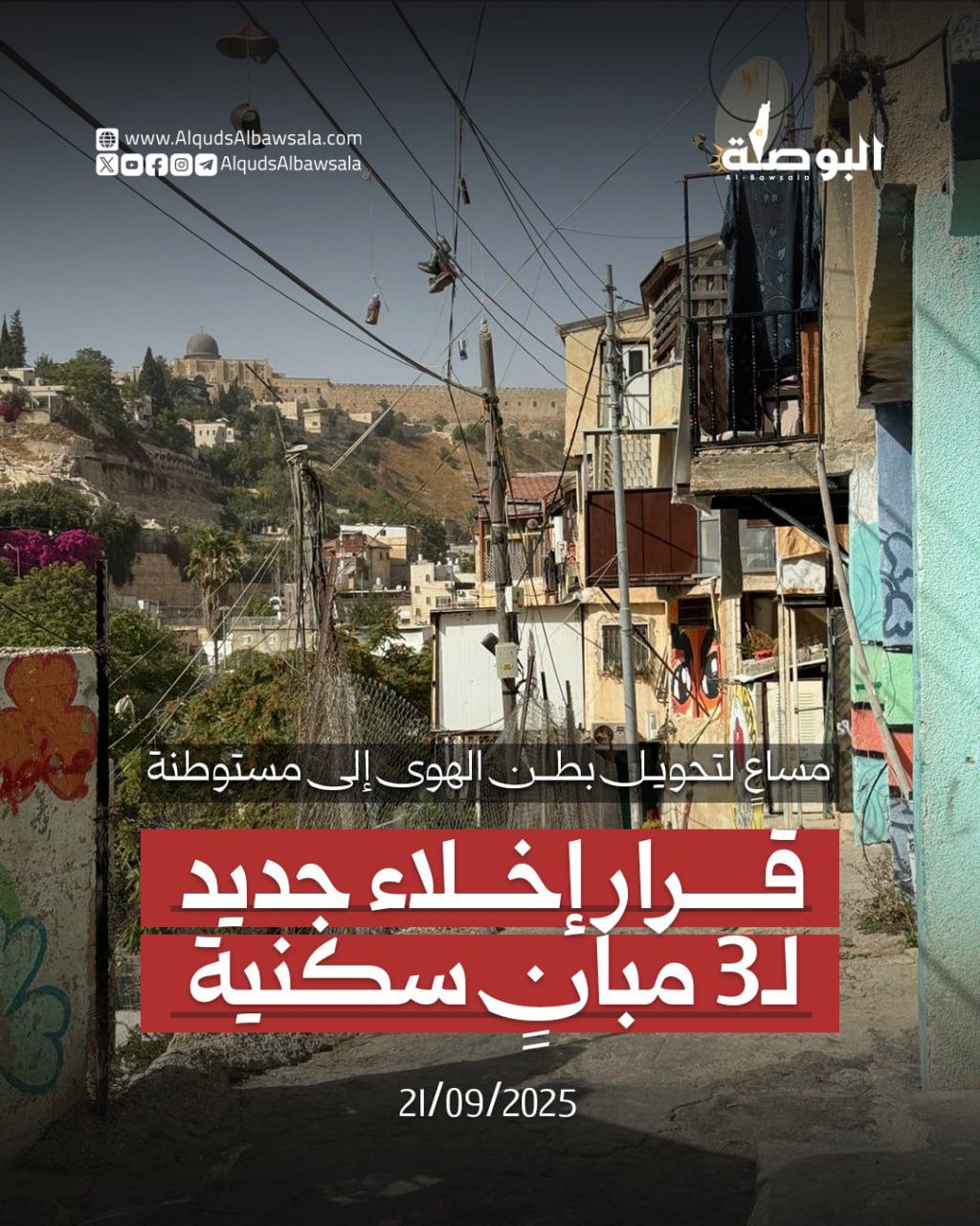 تسارع غير مسبوق| أصدرت محكمة الاحتلال المركزية، أمس الأحد، قرارا بإخلاء 3 مبانٍ سكنية تعود لعائلة الرجبي في حي بطن الهوى ببلدة سلوان جنوب المسجد الأقصى. وذلك بعد أسبوع واحد على تسليم قرار مشابه لإخلاء عائلتي بصبوص والرجبي من 10 شقق سكنية في الحي.