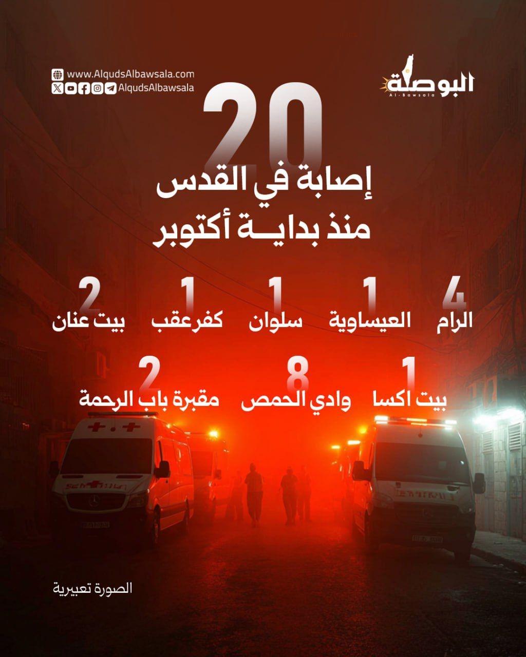 20 إصابة رصدتها شبكة "القدس البوصلة" في القدس وضواحيها برصاص الاحتلال، منذ بداية شهر أكتوبر/تشرين أول الجاري.