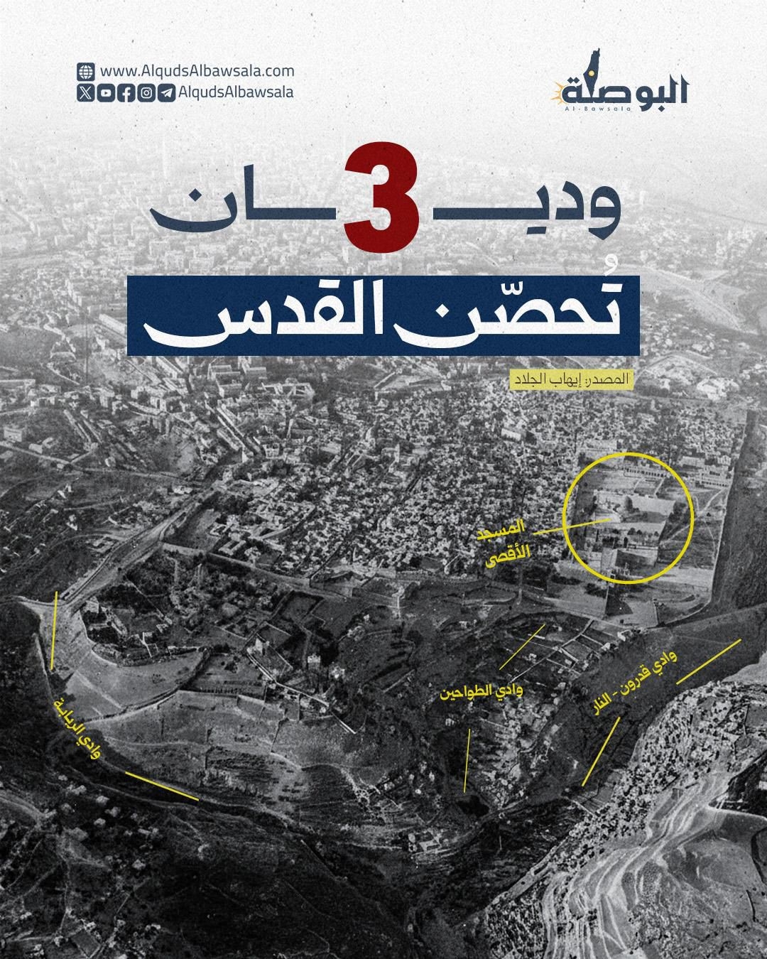 صورة جوية للقدس بين عامي 1930 و1940 توضح أسماء الوديان الثلاثة التي تحيط بالقدس.