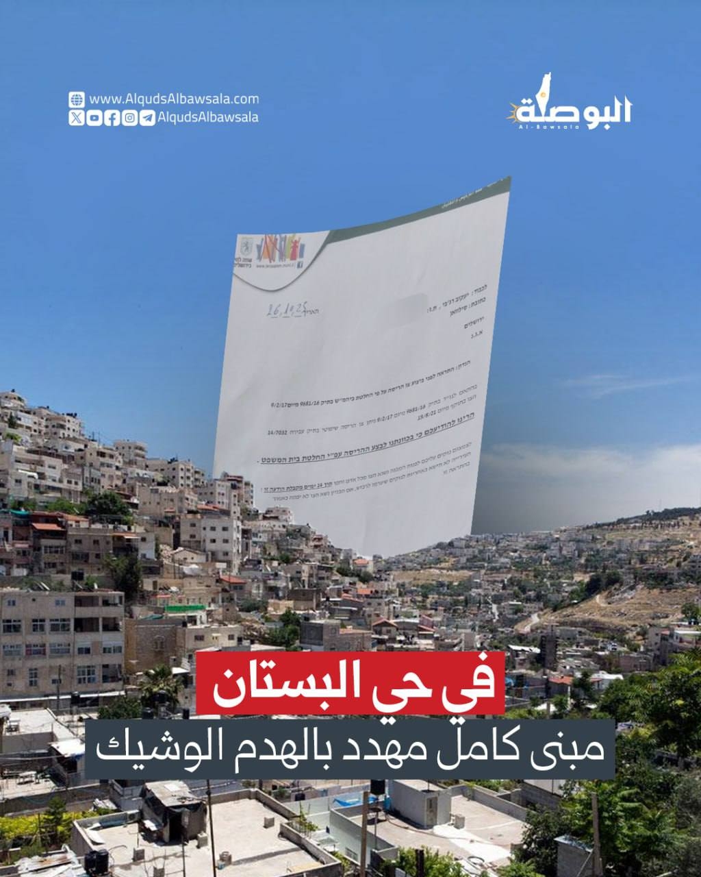 سلمت بلدية الاحتلال، صباح اليوم، المقدسي يعقوب الرجبي، قرارا نهائيا بهدم بنايته السكنية -تحوي عدة شقق- في حي البستان ببلدة سلوان جنوب المسجد الأقصى، على أن يُنفذ الهدم خلال 14 يوما.