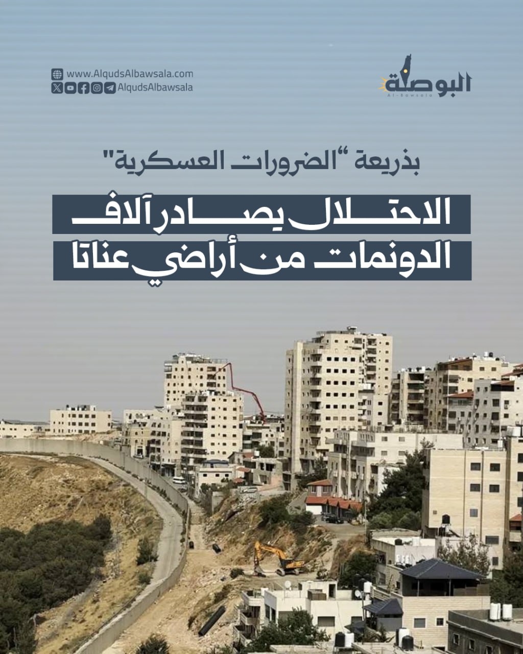 أصدرت سلطات الاحتلال الإسرائيلي أمرًا عسكريًا جديدًا يقضي بالاستيلاء على نحو 5,856 دونمًا من أراضي بلدة عناتا شمال شرق القدس، بزعم “الضرورات العسكرية”.
