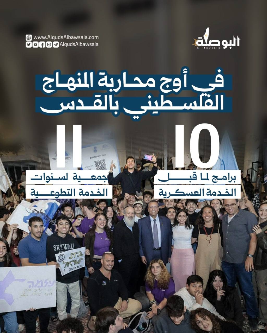 احتفل رئيس بلدية الاحتلال بالمئات من مستوطني القدس الذين أنهوا تدريباتهم استعدادا للانخراط في جيش الاحتلال، وقال متفاخرا إن القدس تضم حاليا 10 برامج لما قبل الخدمة العسكرية، و11 جمعية لسنوات الخدمة التطوعية في الجيش.