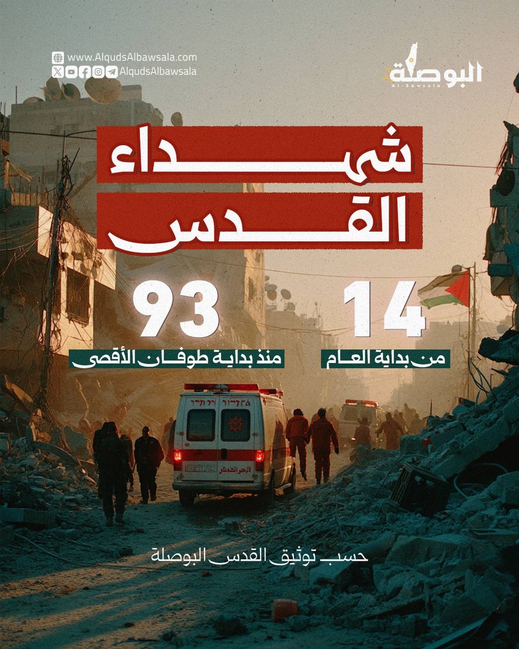 توثيق شبكة "القدس البوصلة": مع ارتقاء الطفلين المقدسيين محمد عبد الله تيم (16 عامًا) ومحمد رشاد فضل قاسم (16 عامًا) من قرية الجديرة شمال غرب القدس، اليوم، يرتفع عدد الشـ.ـهداء المقدسيين منذ بداية عام 2025، إلى 14, ومنذ السابع من أكتوبر/تشرين أول 2023 إلى 93.