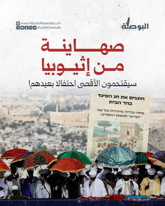 🚨لأول مرة.. دعت جماعات الهيكل المزعوم الصهاينة الإثيوبيين إلى اقتحام المسجد الأقصى، غدا الخميس؛ احتفالا بعيدهم المسمى "سيجد"، والذي سيتقاطع أيضا مع عشية الشهر العبري الجديد، ما يعني ارتفاعا في أعداد المقتحمين.