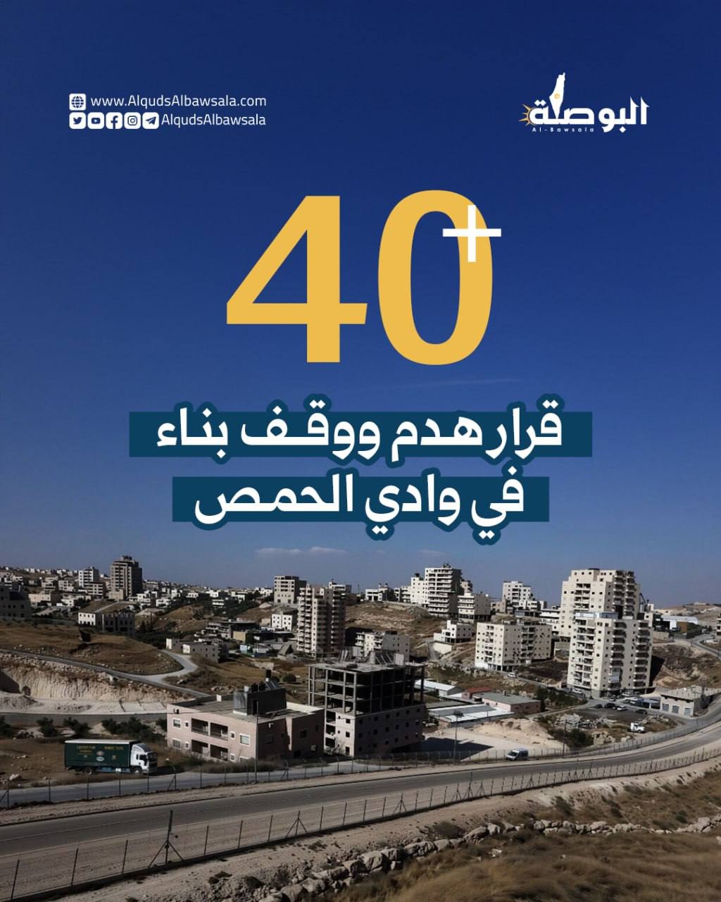قال إعلام محافظة القدس إن الاحتلال وزع خلال اليوم وأمس، أكثر من 40 إخطارًا بين أوامر هدم ووقف بناء في حي واد الحمص جنوب شرق القدس، رغم أن بعض المنشآت واقعة ضمن مناطق مصنّفة (أ) وتحمل تراخيص فلسطينية رسمية.