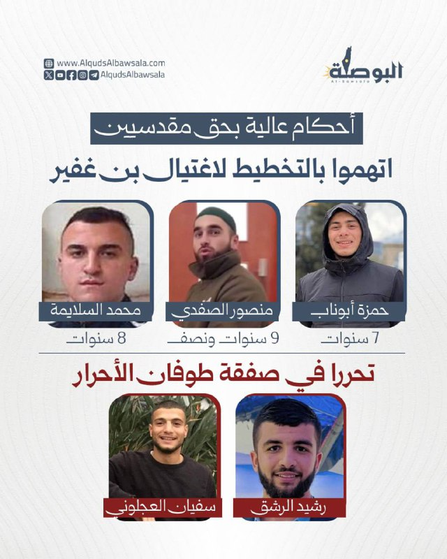5مقدسيين في ريعان شبابهم، اعتقلوا عامي 2021 و2022، وتعرضوا لتحقيق قاسٍ، وحُكموا مؤخرا بأحكام عالية، والتهمة: التخطيط لاغتيال بن غفير (حين كان نائبا في الكنيست).