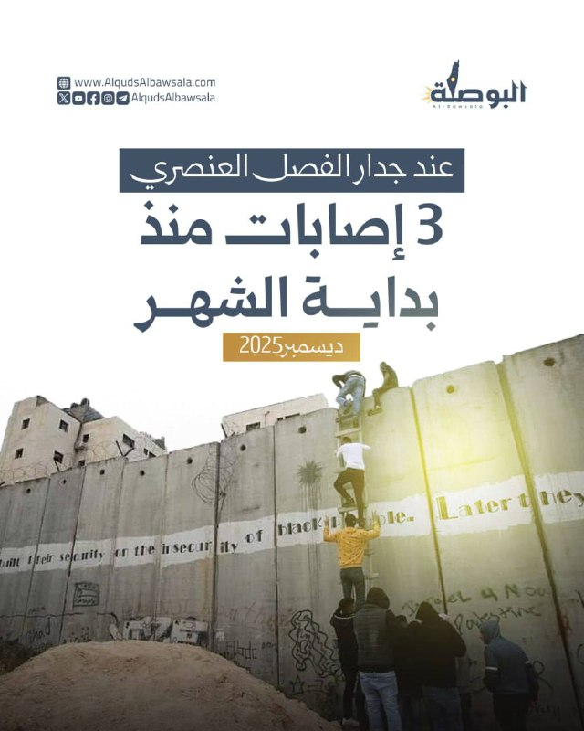 بمعدل إصابة كل يوم! منذ بداية شهر ديسمبر الجاري، وثقت "القدس البوصلة" 3 حالات إصابة برصاص الاحتلال، في صفوف عمالٍ فلسطينيين حاولوا دخول القدس، من جدار الفصل العنصري في بلدة الرام شمال القدس، إلى جانب إصابتين عشية بداية الشهر (مساء الأحد).
