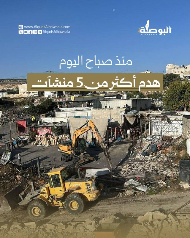 منذ صباح اليوم، هدمت جرافات الاحتلال أكثر من 5 منشآت شمال شرق القدس المحتلة، بينها بركسان تجاريان ومغسلة للسيارات تعود للمقدسي محمد أبوصباح في قرية حزما. إضافة إلى هدم متنزه وملعب رياضي واقتلاع أشجار في قرية مخماس.