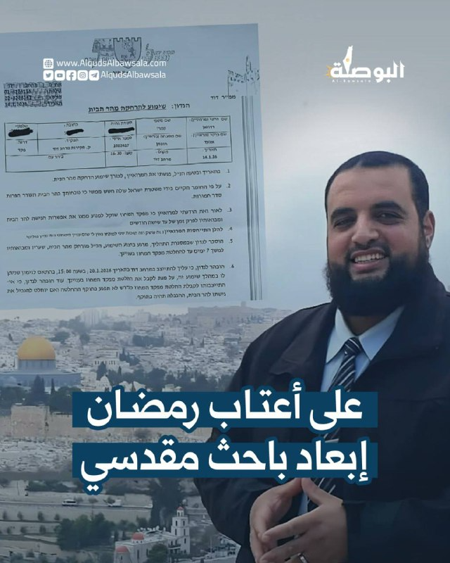 بعد أسبوع من إبعاد والده.. سلمت مخابرات الاحتلال الباحث المقدسي رضوان جمال عمرو قرار إبعاد عن المسجد الأقصى لمدة أسبوع قابل للتجديد 6 أشهر، وذلك بعد استدعائه إلى مركز شرطة القشلة بالقدس صباح اليوم.
