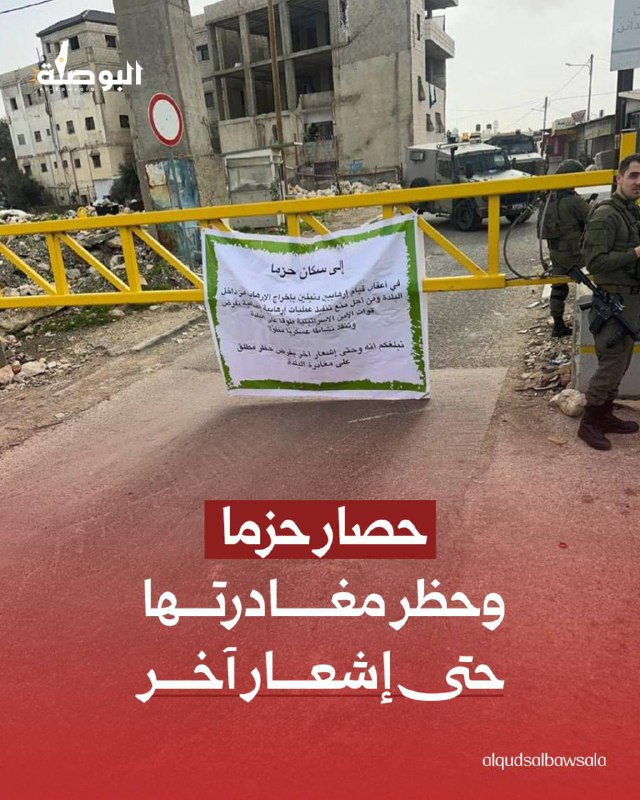 اقتحمت قوات من جيش الاحتلال قرية حزما شمال شرق القدس المحتلة، وأعلنتها منطقة عسكرية مغلقة، وأغلقت مداخلها ومنعت الخروج منها حتى إشعار آخر. بحجة منع تنفيذ "أعمال إرهابية".
