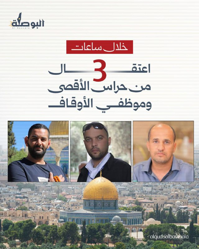 اعتقلت قوات الاحتلال خلال أقل من 24 ساعة 3 من حراس المسجد الأقصى وموظفي دائرة الأوقاف الإسلامية، وهم: عبد الرحمن الشريف، مهدي العباسي، وحسام سدر.