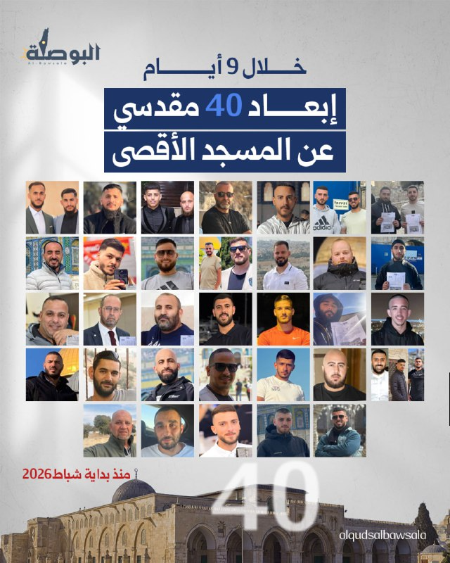 هل تعلم أن الاحتلال ومنذ بداية شهر فبراير/شباط الجاري (أي خلال 9 أيام) أبعد 40 مقدسيا عن المسجد الأقصى المبارك، لفترات تصل إلى 6 أشهر، لينضموا إلى أكثر من 130 مبعدا تسلموا القرارات الشهر الماضي.