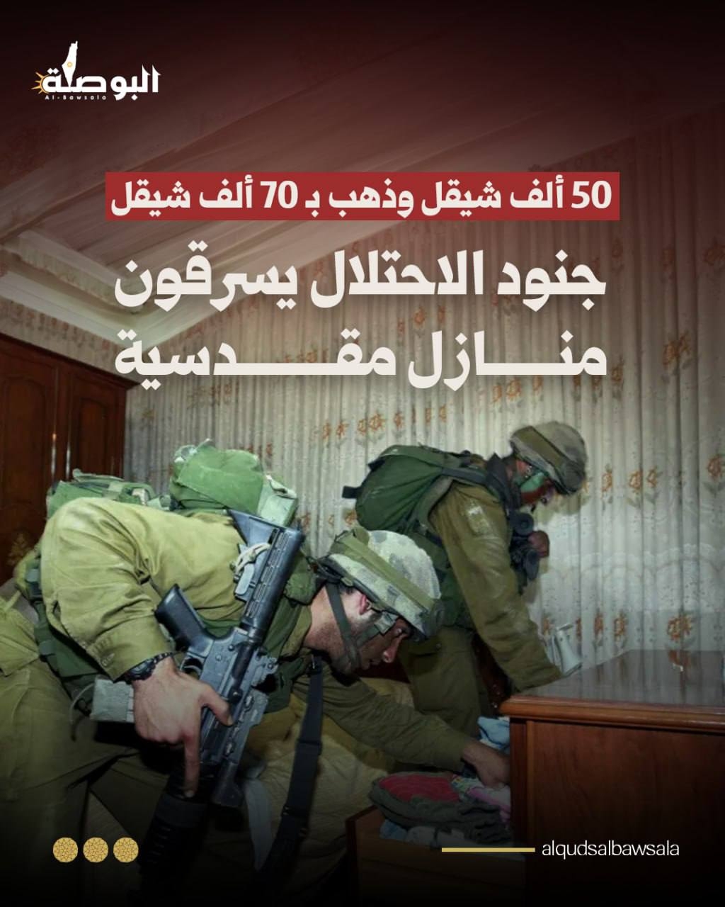 سرق جنود الاحتلال مبلغ 50 ألف شيقل من أحد المنازل، ومصاغ ذهبي بقيمة 70 ألف شيقل.