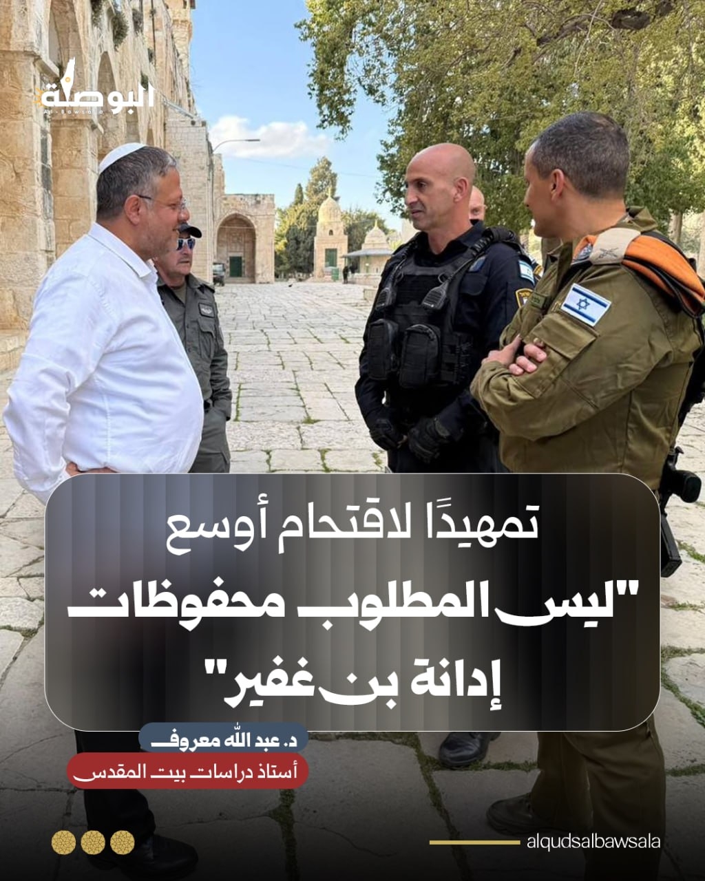 ويضيف: "ليس المطلوب محفوظات إدانة بن غفير، بل التصدي الفعلي لحقائق التهويد التي يفرضها واحدةً تلو الأخرى!"