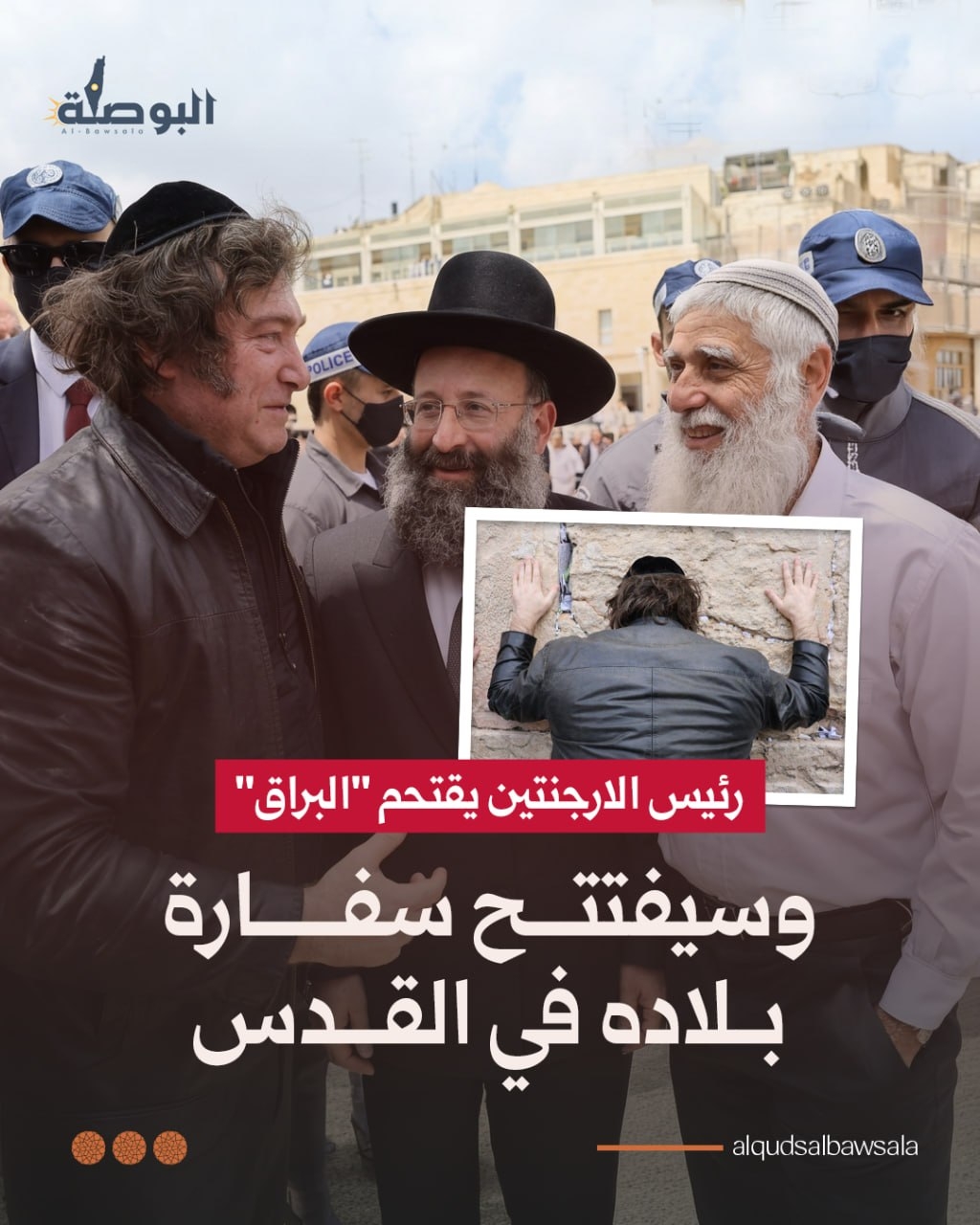 اقتحم الرئيس الأرجنتيني "خافيير ميلي" حائط البراق المحتل غرب المسجد الأقصى، خلال زيارته إلى الاحتلال الإسرائيلي ضمن مشاركته في مراسم احتفال ما يطلقون عليه "استقلال إسرائيل".