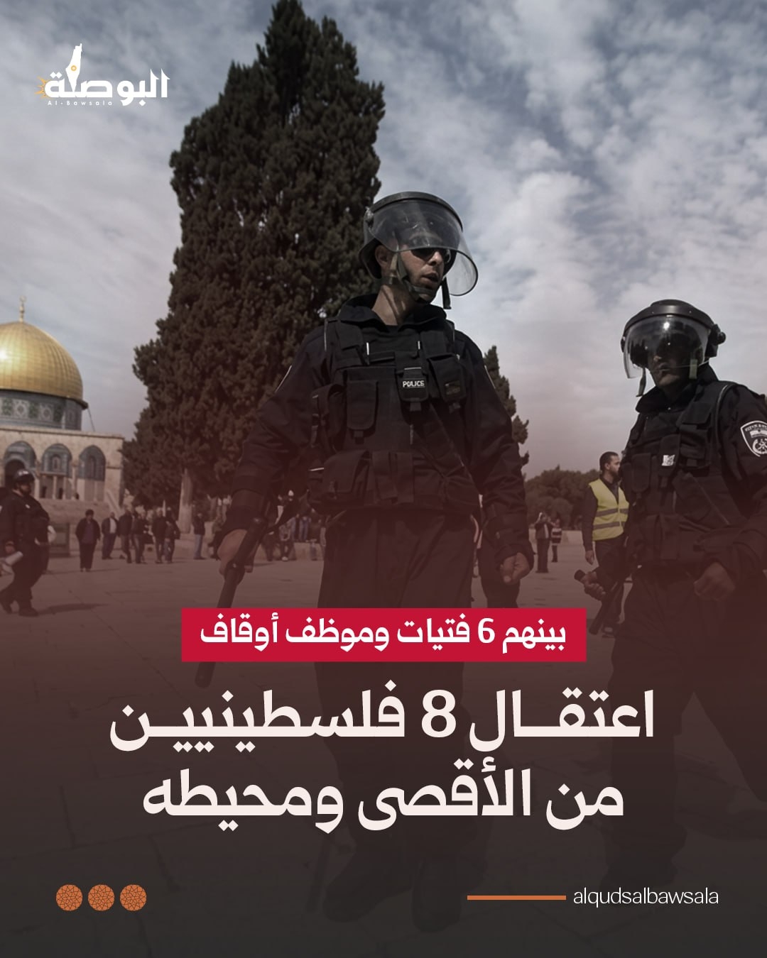 اعتقلت شرطة الاحتلال الإسرائيلي، اليوم، 8 مواطنين من المسجد الأقصى ومحيطه، وفقًا لمركز معلومات وادي حلوة في القدس.