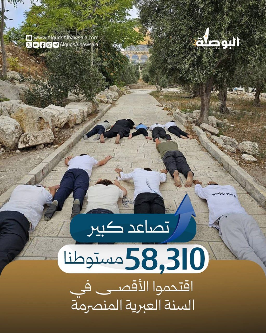 قالت جماعات الهيكل المزعوم إن *58,310* مستوطنا اقتحموا المسجد الأقصى على مدار السنة العبرية المنصرمة (*5785*)، في رقم أعلى بنسبة *14٪* مقارنة بالعام الماضي، وأعلى بخمسة أضعاف مقارنة بالعقد الماضي.