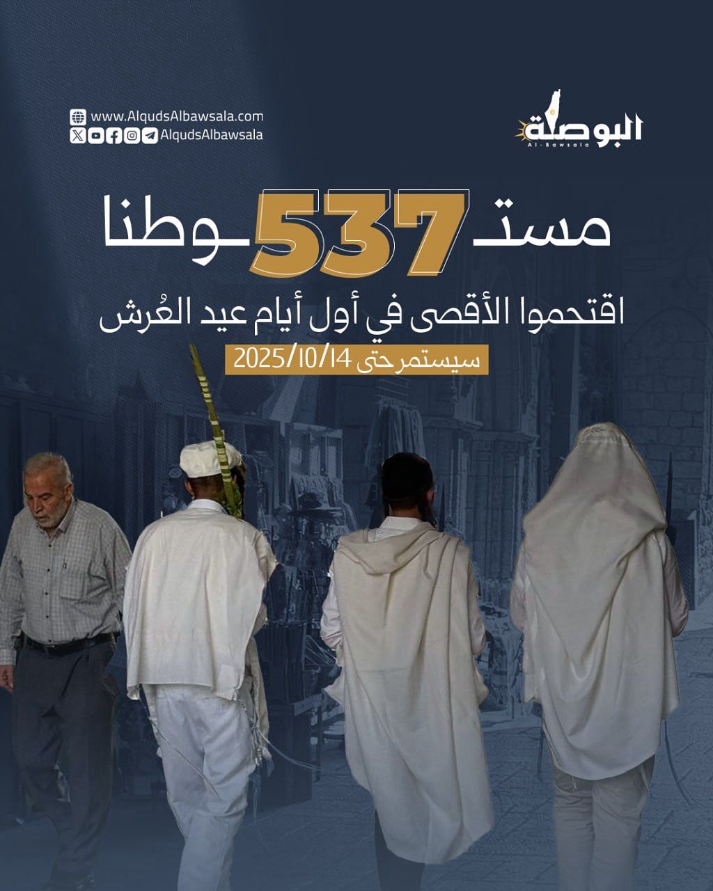 أكثر من 537 مستوطنا اقتحموا المسجد الأقصى، صباح وظهر اليوم، احتفالا بعيد العُرش اليهودي، حيث شهد المسجد أداء طقوس وصلوات علنية جماعية.