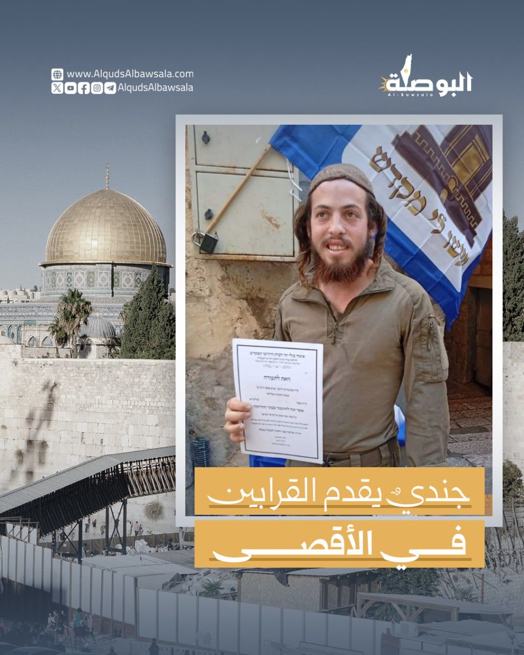 جندي إسرائيلي يفتخر بتقديمه القرابين النباتية داخل المسجد الأقصى وهو يرتدي الزيّ العسكري، وذلك احتفالا بعيد العُرش اليهودي.