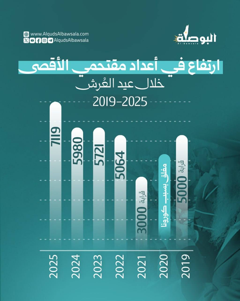 ارتفاع بنسبة 19% مقارنة بالعام الماضي.. رصدٌ لمجموع مقتحمي المسجد الأقصى خلال عيد العُرش اليهودي (سوكوت)، بين الأعوام 2019 و 2025.