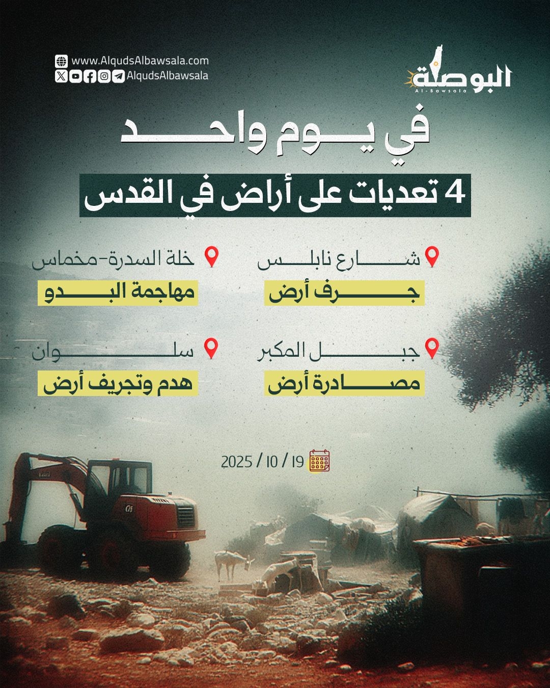خلال ساعات من اليوم الأحد، اعتدى الاحتلال ومستوطنوه على 4 أراضٍ في القدس المحتلة على النحو التالي: