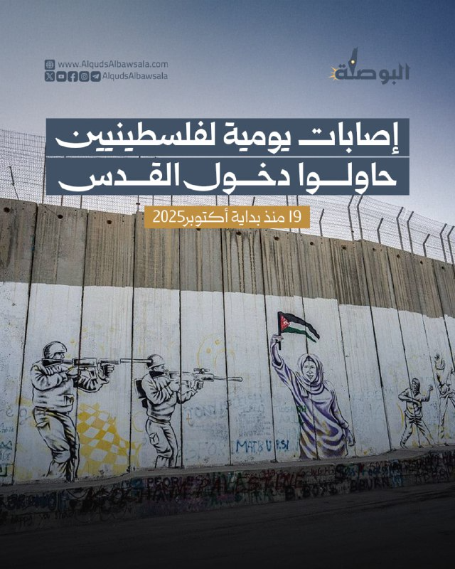 3 إصابات جديدة خلال 24 ساعة.. أفادت طواقم الهلال الأحمر الفلسطيني بإصابة 3 شبان فلسطينيين -من الضفة الغربية- برصاص الاحتلال قرب الجدار الفاصل في بلدة الرام شمال القدس، أثناء محاولتهم دخول القدس للعمل، وذلك عصر الإثنين الماضي، ومساء أمس الثلاثاء.