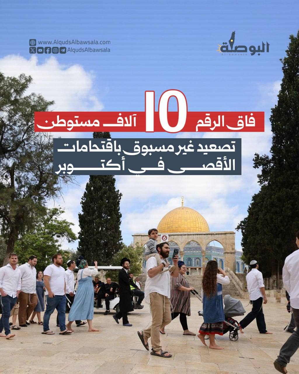 بحسب إحصائيات "القدس البوصلة"، شهد شهر أكتوبر تصعيدًا واسعًا في اقتحامات المسجد الأقصى المبارك، حيث بلغ عدد المستوطنين الذين اقتحموا المسجد نحو 10,822 مستوطنًا، في زيادة لافتة تزامنت مع أعياد “يوم الغفران” و“عيد العُرش”.