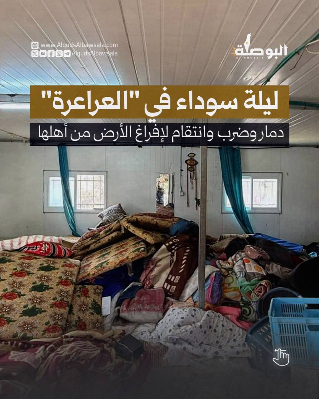 مع الفجر، دوّى صراخ الأطفال في تجمع العراعرة البدوي شرق القدس، بعدما اقتحمت قوات الاحتلال المكان، وبدأت بتكسير البيوت وضرب الأهالي وتحطيم محتويات منازلهم في مشهدٍ يؤكد استمرار سياسة التهجير القسري ضد التجمعات البدوية.