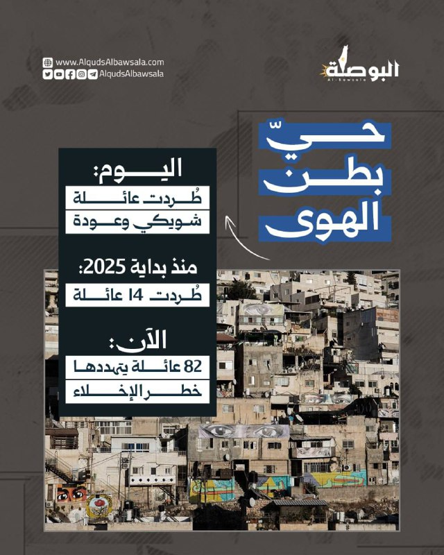 في حيّ بطن الهوى، طرد الاحتلال اليوم عائلتي شويكي وعودة من منزليهما. ومنذ بداية 2025 الجاري طرد 14 عائلة. ما يعني أن المستوطنين يسكنون حاليا مكان 18 عائلة مقدسية طُردت منذ عام 2015.