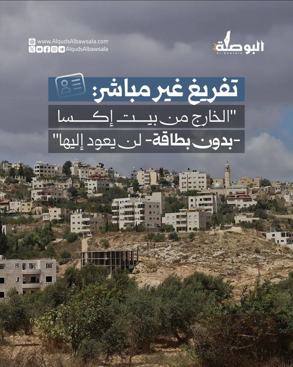 تفريغ غير مباشر قالت بلدية قرية بيت إكسا شمال غرب القدس إن "الارتباط الإسرائيلي" أبلغها بأن من لا يحمل "البطاقة الممغنطة" لن يتمكن من الدخول القرية، حتى ولو كان من سُكانها.
