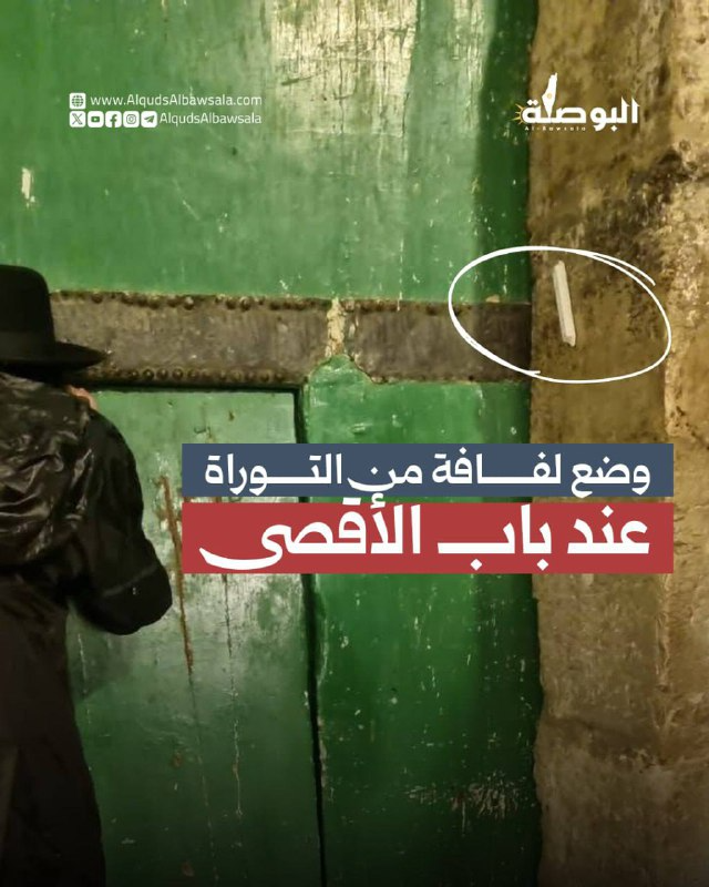 خطير| ثبّت حاخام إسرائيلي، فجر اليوم، لفافة توراة مُحرّفة -تُدعى مزوزاه-، على حجارة باب القطانين أحد أبواب المسجد الأقصى الغربية. حيث يعتقدون أنها تجلب البركة والحماية.