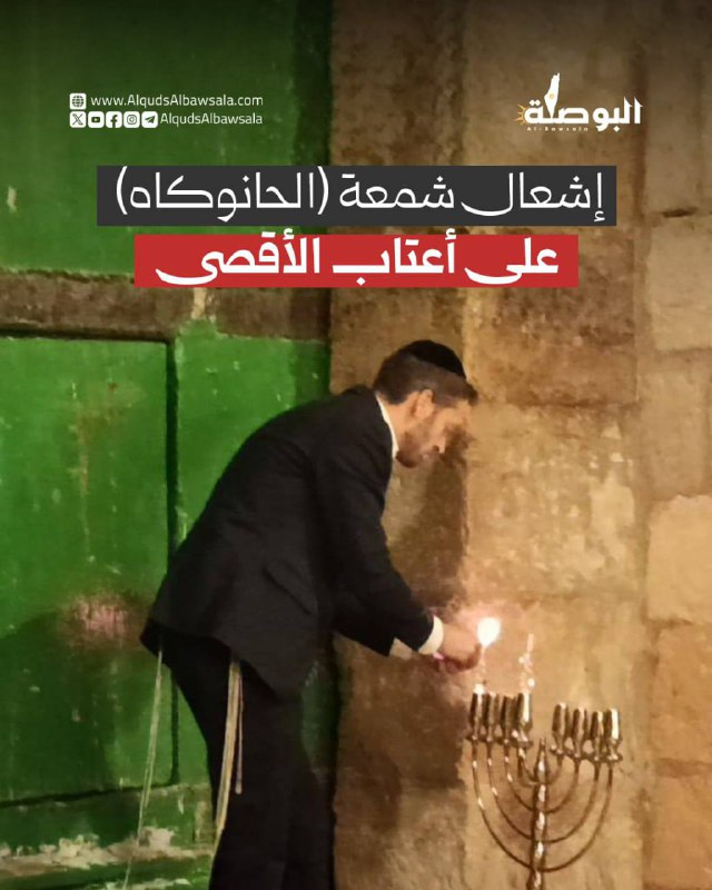 أقدم مستوطن، ليلة أمس، على إشعال الشمعة الأولى في شمعدانٍ، نصبه عند باب القطانين أحد أبواب المسجد الأقصى الغربية، وذلك احتفالا بعيد الأنوار اليهودي (الحانوكاه).