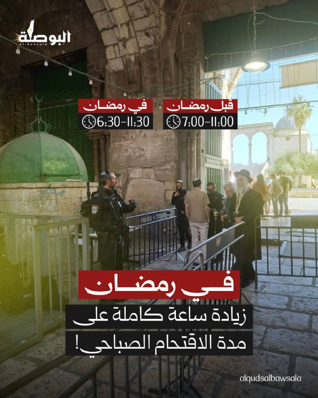 إرضاء لجماعات الهيكل.. تنوي شرطة الاحتلال رفع مدة الاقتحام الصباحي، خلال شهر رمضان المبارك، ساعة كاملة، حيث سيبدأ الاقتحام الساعة 6:30 بدلا من 7:00، وسينتهي 11:30 بدلا من 11، أي قبل دقائق من صلاة الظهر.